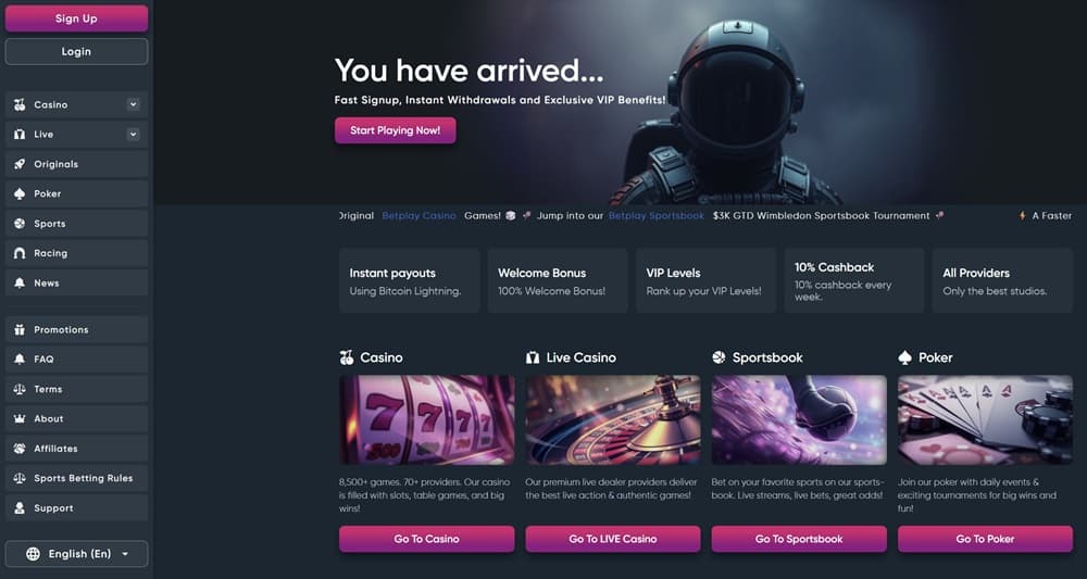 - Registration: Visit Betplay.io, click “Sign Up,” enter an email and password. No KYC is required. Make sure to use the VIP-bet promo code VIPBET to get the best-possible bonus package.